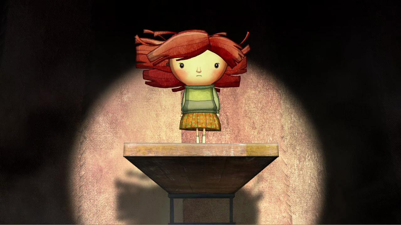 There is an oddly comforting charm about Anina, a quirky, warm, simply-but-beautifully animated picture with a look that seems hand crafted from materials gently worn and loved. The title character is endearing, with her bright ruddy red hair, striped leggings, and big head. Her name is a palindrome — mean- ing it reads the same both backwards and forwards — and it causes her grief from taunting classmates. She in turn takes it out on another girl, Yisel, and an ensuing tussle lands the two of them in the principal’s office. There, they are each handed a black wax-sealed envelope and told they must carry it around for a full week, seal unbroken, before returning to discover the punishment inside. The curiosity and temptation become too much for Anina, and she begins having “Heffalumps and Woozles” type nightmare fantasies about the unknown punishment, complete with flying headmistresses and cackling teachers. Itching for an answer, she follows Yisel in hopes of sneaking a look at her envelope — only to discover that they have more in common than an uncommon punishment.