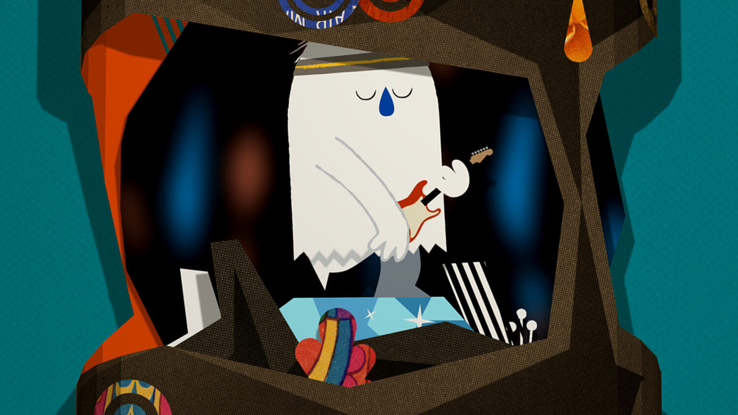 Neon paper cutouts create a continuously spiraling stage for an Apache guitarist and his Yeti band mate, as they perform a twangy throwback to 60’s surf-rock and spaghetti western soundtracks.