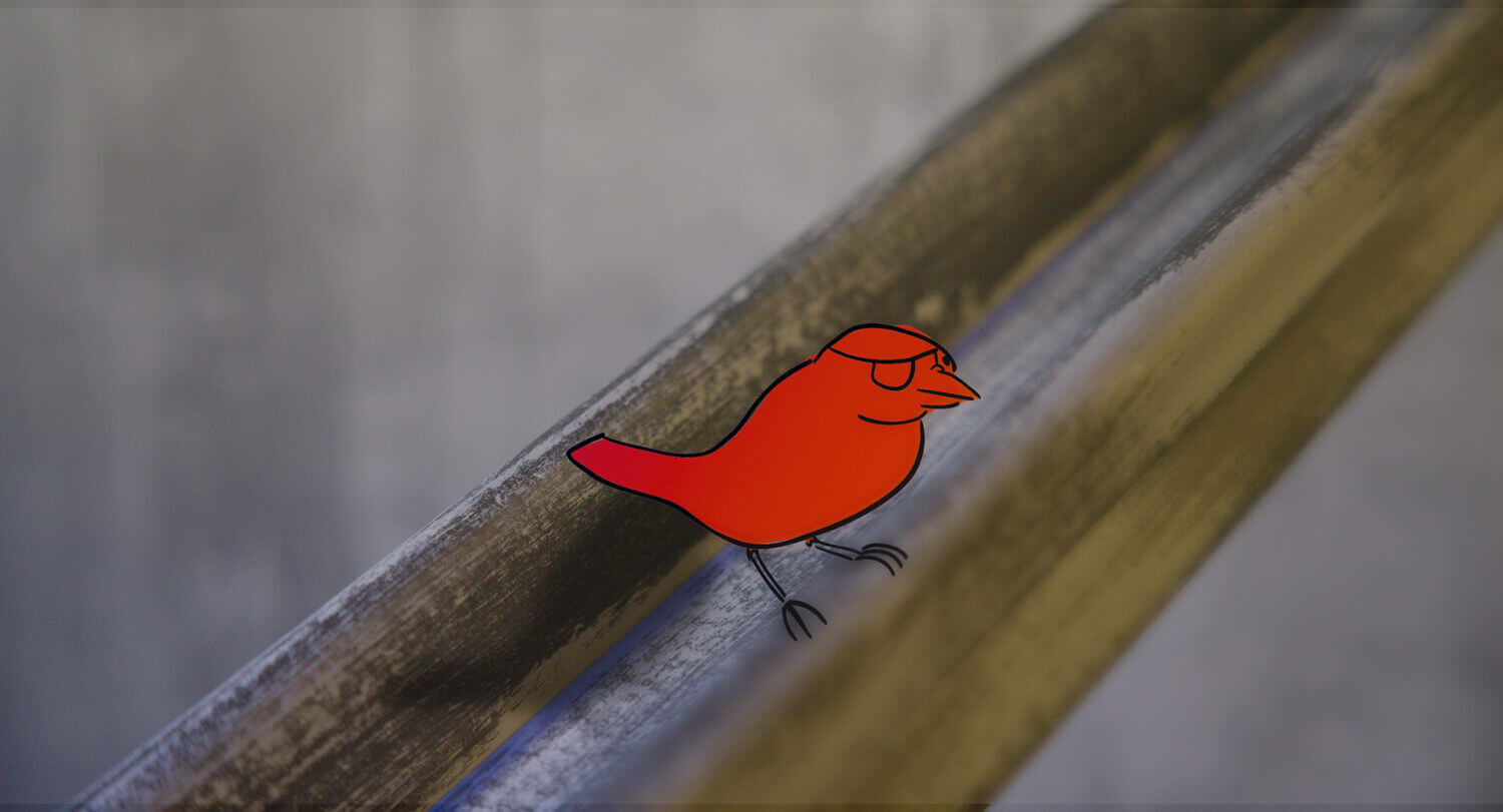 In a bird cage factory, a security camera is won over by a red finch with some serious dance moves.