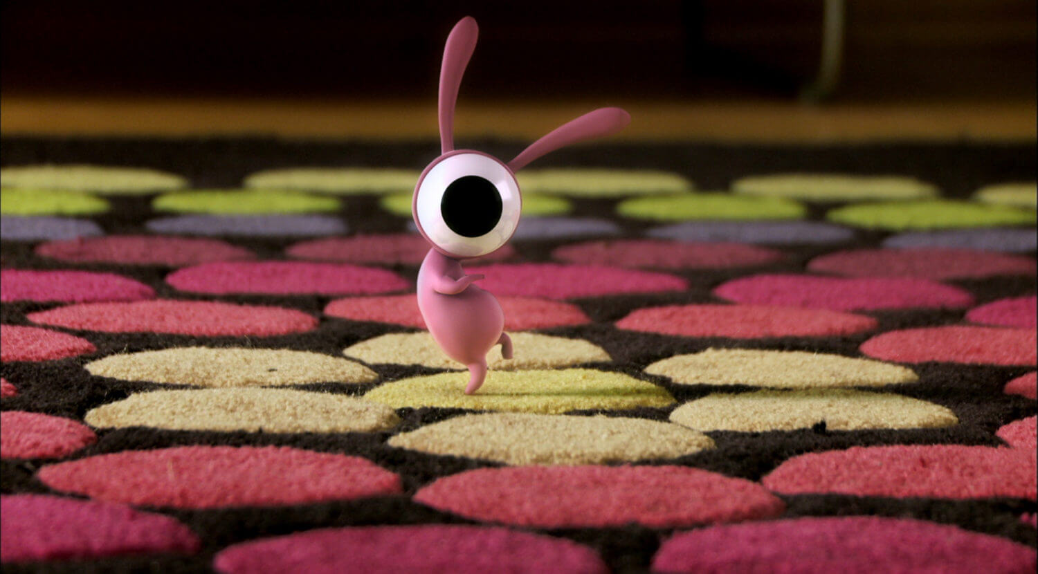 Awesome, thumpy, electronic disco music propels this non-stop chase scene of a movie — as a cute, pink-bellied, one-eyed CGI bunny gets chased around an apartment by a live action black cat.